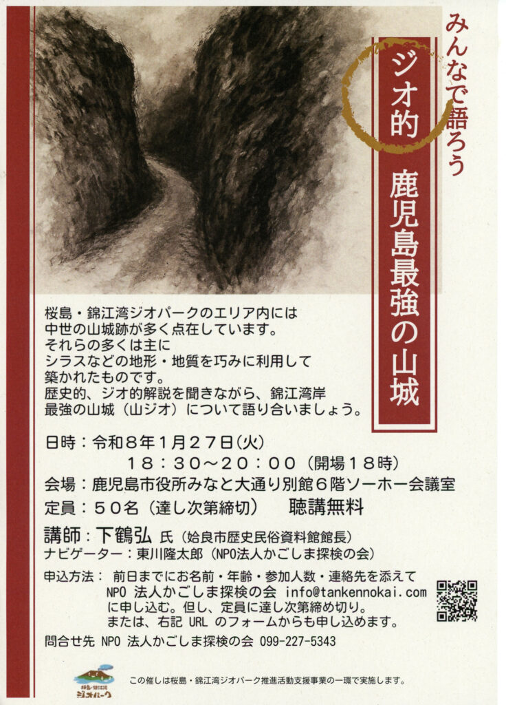 桜島・錦江湾ジオパークエリア内の中世山城跡について歴史的、ジオ的観点から錦江湾沿岸最強の山城(山ジオ)について語り合う講演会です。